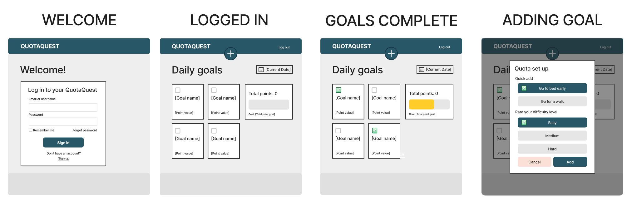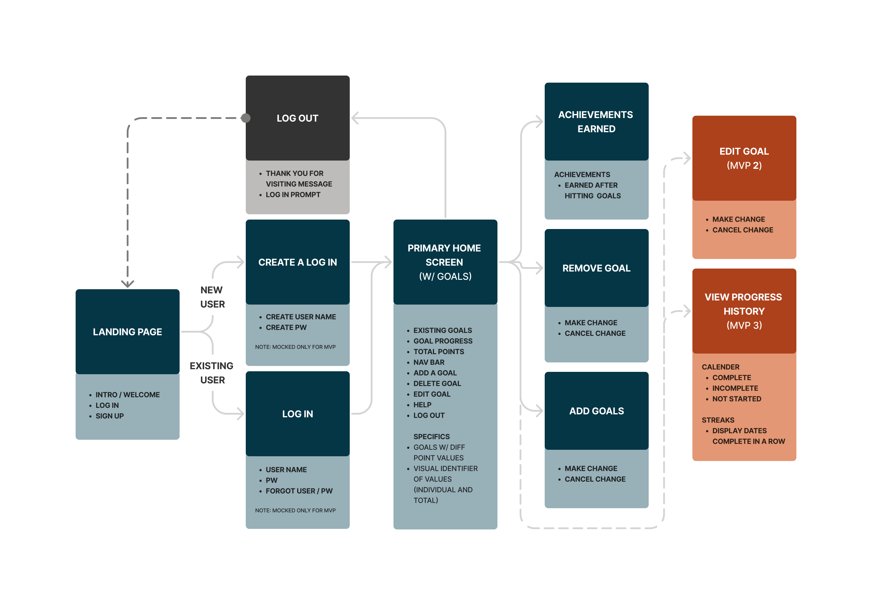 I started with a basic color pallet, choosing a moody, rich blue and a complimentary salmon color. I laid out the basics of the minimum behavior I hoped to achieve, considered basic patterns of actions users could take, and visuals of the user's progress. I knew as I moved into design, I could expand on behaviors, styles, and future enhancements that could be made in future experiences.
