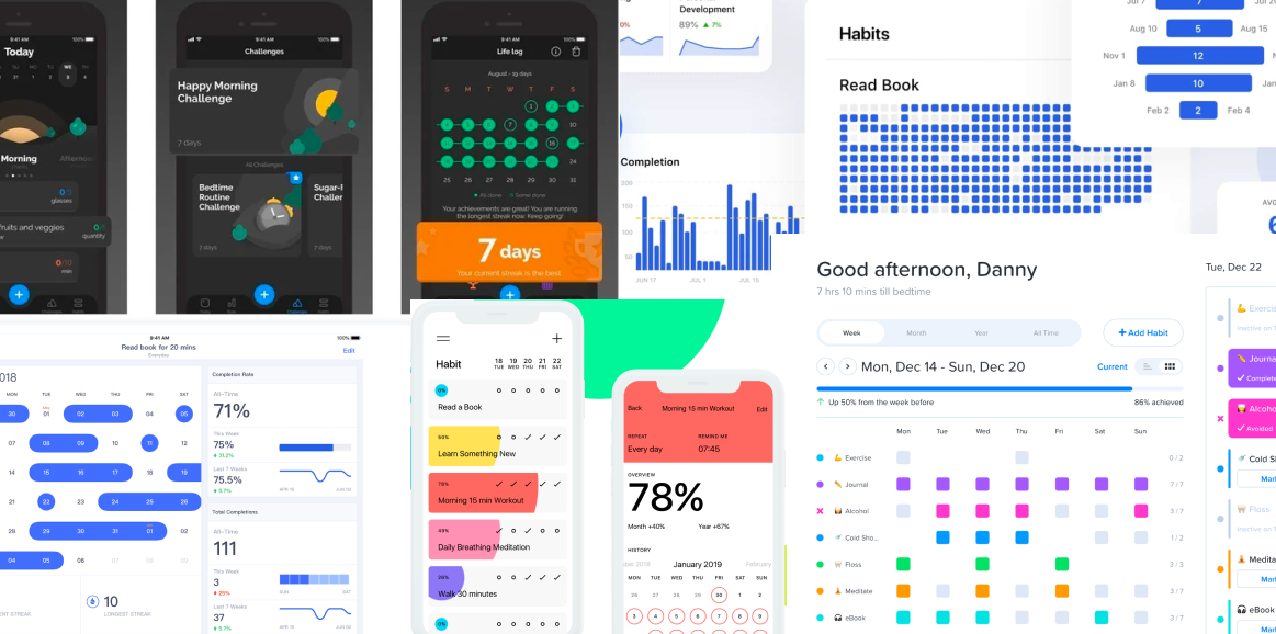 While researching digital habit trackers, I noticed common themes such as overall goal progress, history, and visualizations of progress today vs. days in the past. These themes were often displayed in bright colors and airy designs.